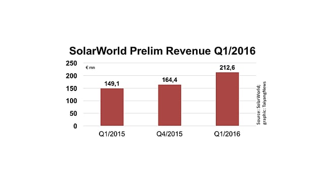 Germany's SolarWorld has provided good sales and shipment numbers in its preliminary business results for the first quarter 2016. With group wide shipments up 62% and touching 341 MW in Q1/2016, from 210 MW during the same period in 2015, it increased consolidated revenue by 42.5% to € 212.6 million, from 149.1 million in Q1/2015.