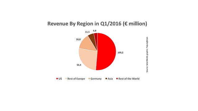 It improved its revenues for the reporting quarter to €212.6 million, up by over 42% from the first quarter of 2015, but a drop of 8.2% sequentially. The US continued to be its strongest market contributing €109.2 million, making up 51.3% of the total revenue, followed by rest of Europe at €56.4 million and Germany at €28.8 million. The large scale orders for projects in the US and France helped improve the shipment. Overall, the foreign quota of revenue dropped to 86.4%, as compared to 91.2% in the year before.