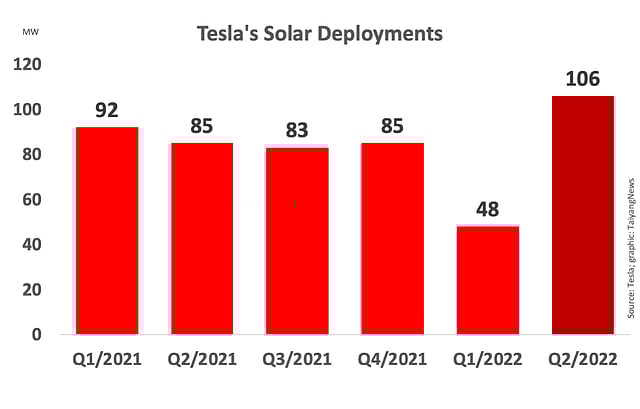 American automotive and clean energy business Tesla has reported its solar installations in Q2/2022 having grown 25% annually to 106 MW, calling it the company's strongest quarterly result in over 4 years.