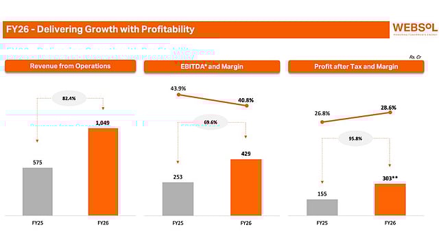 During Q4 FY2026, Websol’s revenue increased 132.1% YoY to INR 401 crore, while PAT grew 157.9% to INR 125 crore over the same period. EBITDA of INR 146 crore for the quarter increased by 86.4%, but EBITDA margin dropped from 45.4% to 36.4%.