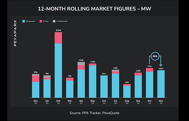 Swiss market intelligence provider for renewable energy, Pexapark, said that as of November 2024, 18 Power Purchase Agreements (PPAs) were signed to the tune of 1.054 GW. However, this represents a 10% decline in disclosed volumes and a more pronounced 26% drop in deal count, as compared to October 2024.