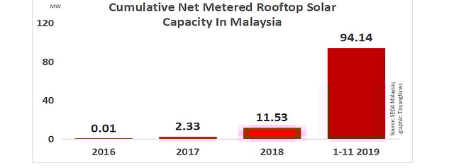 Till the end of November 2019, net metered solar PV capacity approved in Malaysia had reached 108 MW as per data released by the country's Sustainable Energy Development Authority (SEDA). It shows this capacity development since 2016 with the maximum reported for the first 11 months of 2019 when 94.14 MW was approved. This is 7.8 times more than the previous three years put together that added up to 13.86 MW.