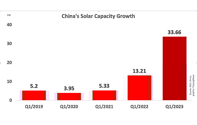 Since the country installed 20.37 GW within January 2023 and February 2023, in the month of March 2023 it is likely to have brought online 13.29 GW, making it the largest Q1 since 2019. It also means much stronger year-on-year growth over Q1/2022: 20.45 GW more solar capacity was added in the first 3 months of this year (see China Installed Over 20 GW New Solar In First 2 Months Of 2023).