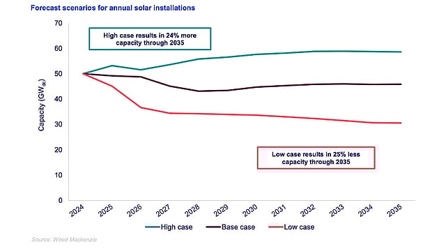 On the other hand, the low case scenario presents a more challenging environment anticipating an early phase-out of the ITC, among other factors. It also assumes a limited supply of solar products due to a modest domestic manufacturing build-out. In this scenario, the total solar installations will likely decrease by 127 GW DC or 25% through 2035 compared to the base case.