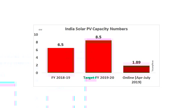 India's official solar power capacity target for FY 2019-2020 is 7.5 GW for large scale solar and 1 GW for rooftop PV. The cumulative installed number of over 30 GW contributes to 81.30 GW of total renewable energy capacity of the country till July 2019.