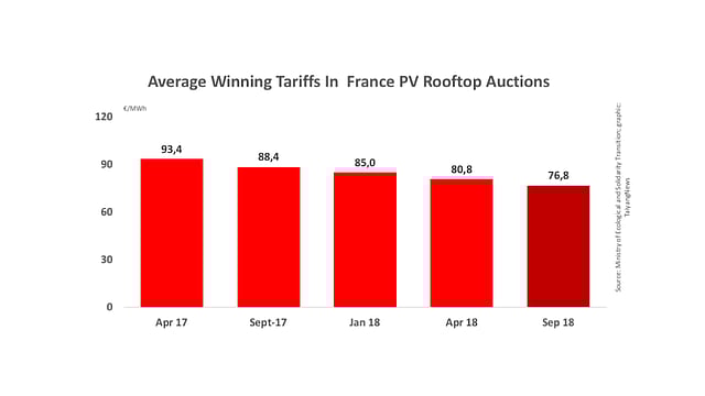 French Ministry of Ecological and Solidarity Transition has selected 392 projects in the 5th round of rooftop solar power auction, awarding a cumulative of 230 MW projects for an average winning tariff of €76.8 ($89.5) per MWh, dropping almost 5% from last auction's €80.8 ($94.2) per MWh (see Prices Drop In French 200 MW Rooftop Tender).