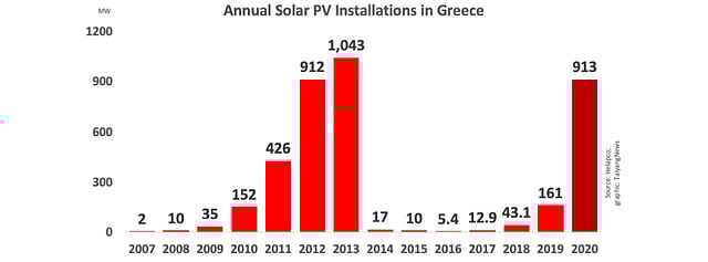 The 913 MW installed in 2020 represents a significant uptake in solar compared to 161 MW Greece added in 2019, all of which was connected to the grid. It is at the same level the country achieved in 2012 when Helapco's statistics show the installations added up to 912 MW. In 2013, annual additions exceeded 1 GW. Installations dropped significantly from 2014 due to significant changes introduced by the administration in regulatory policies.
