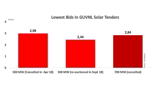 Mercom India Research too said that developers confirmed cancellation of the auction due to high tariffs that shot up because of high solar park charges, something the developer community is not too happy about it as it blames a lack of due diligence on the part of GUVNL before issuing the tender. Other feel that the absence of Indian players among the winners could be the reason behind cancellation.