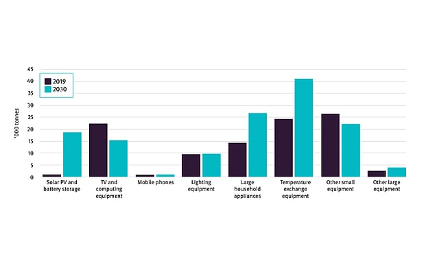 The government estimates 50% of the e-products, by weight, currently entering the state on annual basis as comprising solar PV and battery storage equipment. Altogether these weigh 114,000 tons, mostly PV systems. In 2019, solar panel and battery storage waste accounted for around 1,000 tons but by 2030, it is forecast forecasts to grow the fastest to over 17,000 tons among other categories.
