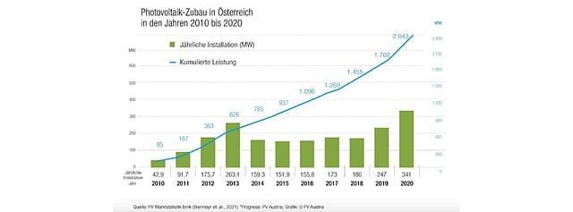 The Photovoltaic Austria Federal Association (PV Austria) says in 2020 the Austrian market saw new solar PV installations of 341 MW, divided as 340.34 MW of grid connected and 500 kW for self-consumption capacity. It reflects an annual growth of over 38% for the year 2020.