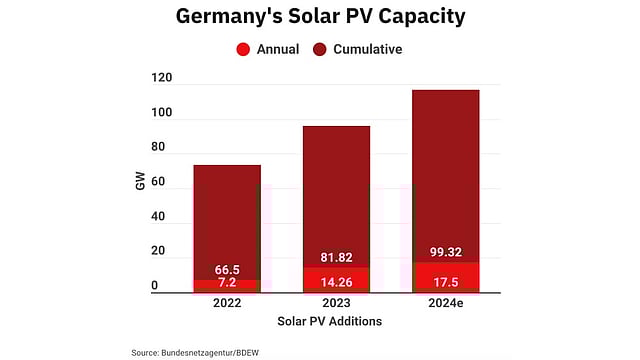 Bundesverband Der Energie- Und Wasserwirtschaft E.V. (BDEW) or the German Association of Energy and Water Industries says Germany will expand its total solar PV capacity by 17.5 GW within 2024. Having exited 2023 with 81.82 GW in cumulative capacity, this would expand its total capacity till the end of this year to around 100 GW.