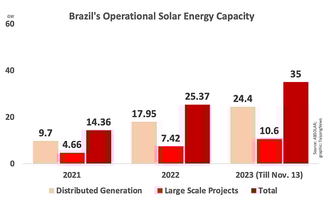 Brazil's total operational solar PV capacity has exceeded 35 GW with the distributed generation (DG) segment accounting for 70% of the lot, said local solar energy association ABSOLAR in a statement on November 13, 2023. The sector now represents more than 1 million jobs.