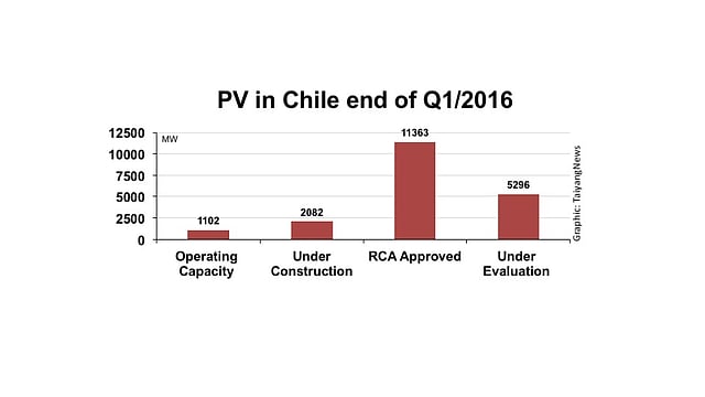 Chile continues its solar leadership role in South America. At the end of first quarter of 2016, it had a total installed PV capacity of 1,102 MW, out of a cumulative installed renewable capacity of 2,496 MW.
