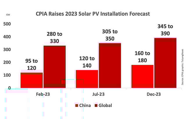 China, the world's largest solar PV market, is to account for 160 GW AC to 180 GW AC of global solar PV installations in 2023, which are likely to settle between 345 GW AC and 390 GW AC, according to the China Solar PV Industry Association (CPIA).
