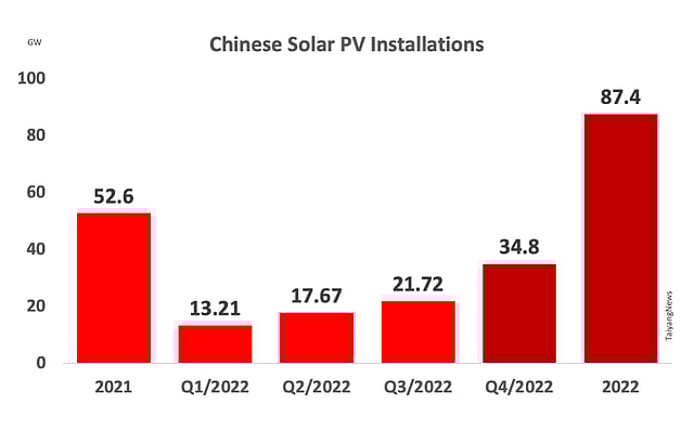 While the NEA does not specify the individual share of various PV segments that contributed to the 87 GW capacity last year, it did count 52.6 GW to have come online during 9M/2022, which would mean in Q4/2022 the world's largest solar market added 34.8 GW (see 9M/2022 Chinese Solar Installations Grew 100%+ Annually).