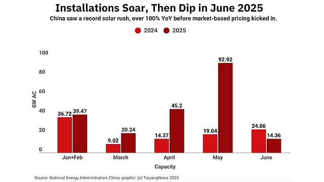 China’s solar additions dropped sharply to 14.36 GW in June 2025 after May's 92 GW rush