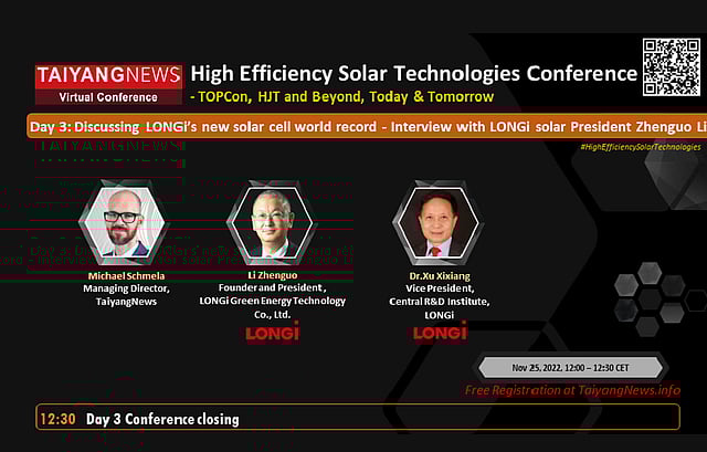 Tomorrow LONGi Founder & President at TaiyangNews Conference: Day 3 of TaiyangNews #VirtualConference on High Efficiency Solar Technologies – TOPCon, HJT and Beyond, Today & Tomorrow will take place on Friday Nov. 25 and will also mark the conclusion of a deeply-insightful Conference. On Day 3, there will be presentations by Youru Tan from BloombergNEF; Jialin Ru from China Photovoltaic Industry Association; Jason Yan from LONGi Solar; Dr Peter Fath from RCT Solutions; Yinchun Wang from LONGi Silicon; Dr Bernhard Kloter from Wavelabs; Gianluca Coletti from TNO. The Conference will end with a very exciting panel discussion in which the participants will be: Li Zhenguo, Founder and President LONGi Green Energy Technology and Dr Xu Xixiang, Vice President, Central R&D Institute, LONGi. The discussion will be moderated by Michael Schmela, Managing Director TaiyangNews. Do join us. For free registrations, click here.