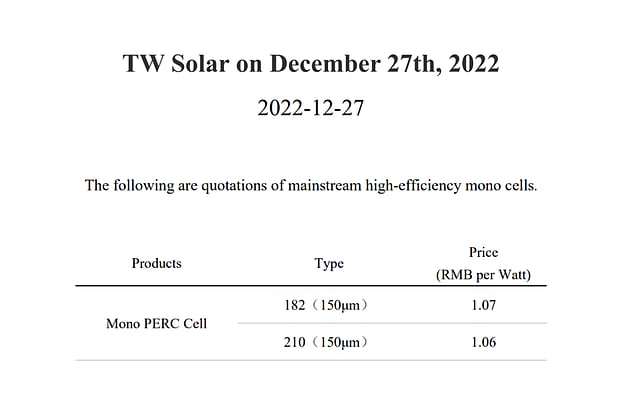 Tongwei releases solar cells prices for December: The world's largest solar cell and silicon manufacturer from China, Tongwei Solar, released the latest prices for monocrystalline PERC cells over a WeChat communication. Here are the details: