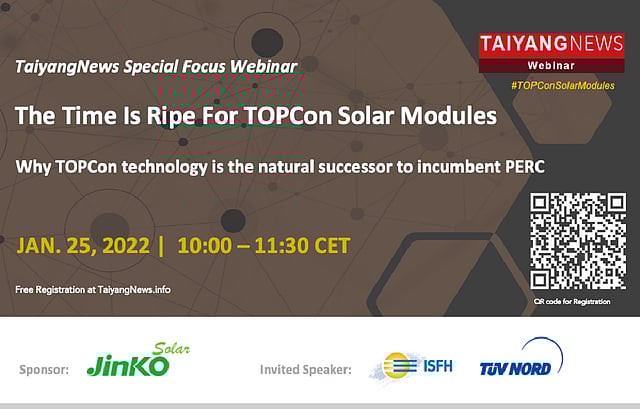 Jinko Solar's Antonio Ruta at TaiyangNews Webinar on Jan 25: Antonio Ruta, Head of Technical Services Jinko Solar Latam and Italy will be taking part in TaiyangNews Webinar titled: The Time Is Ripe For Topcon Solar Modules. He will be talking about How Tiger M10 NEO Modules are lowering LCOE on Utility Projects with Better Energy Yield and BOS Optimization. The Webinar will take place on 25 January 2022 from 10:00 to 11:30 CET. Do join us. For Free Registration, click here and for Agenda, click here.