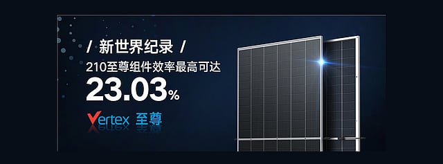 Trina 210 module aperture efficiency rises to 23.03%: Chinese solar module manufacturer Trina Solar's State Key Laboratory of Photovoltaic Science and Technology announced that its developed its Vertex Extreme High-efficiency P-type monocrystalline silicon module, based on 66 high-efficiency 210mm format PERC cells, to reach a record module "aperture" efficiency of 23.03%. It said that this has been approved by third-party testing institutes TÜV Rheinland and TÜV North Germany, who have simultaneously tested and certified that the modules indeed have reached that efficiency level. Recently, TaiyangNews had launched a 210mm Solar Modules Report, in which it covers in detail technology updates from Trina Solar's 210 mm products (see Advantages of 210mm Solar Modules Report)