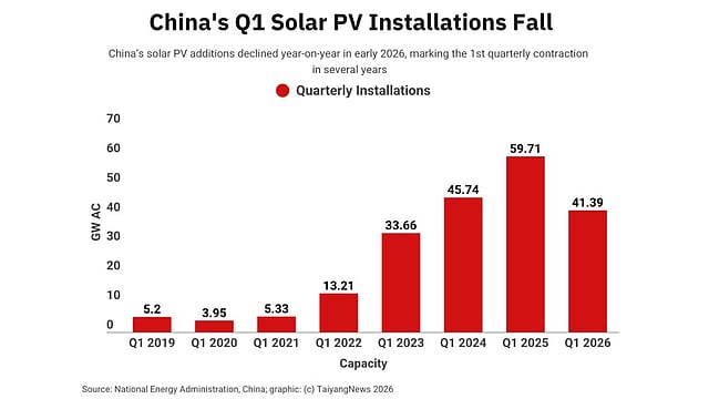 China added 41.39 GW AC of new solar PV capacity in Q1 2026, according to the National Energy Administration (NEA), representing a year-on-year (YoY) decline of 18.47 GW in absolute terms.