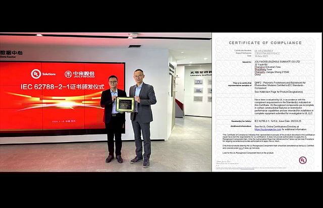UL Solutions’ IEC certification for Jolywood: n-type solar module manufacturer Jolywood announced that its QIHF2 – Polymeric Frontsheets and Backsheets for Photovoltaic Modules have been issued IEC 62788-2-1:2023 certification by UL Solutions, an international independent third-party testing, inspection and certification agency. The company said that it is for the first time that UL Solutions has enabled a new product category number - QIHF2 – while issuing the certification. Meanwhile, a month ago at TaiyangNews annual flagship event: Virtual Conference on High Efficiency Solar Technologies – Today, Tomorrow and Beyond – Part 2, Jolywood Solar’s Senior R&D Director Keng Siew Chan discussed efficiency improvement technology of industrial production for TOPCon solar cells within the C-Chinese company that’s known as a pioneer and very early adopter of n-type technology (see Keng Siew Chan, Jolywood: Study on Efficiency Improvement Technology)