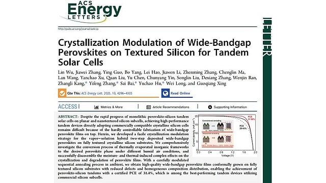 Leading solar manufacturer Tongwei has announced that its perovskite R&D team has published new research in the academic journal ACS Energy Letters, titled Crystallization Modulation of Wide-Bandgap Perovskites on Textured Silicon for Tandem Solar Cells. The study examines the crystallization control mechanism of wide-bandgap perovskites on textured silicon substrates and proposes a method to improve tandem solar cell performance.