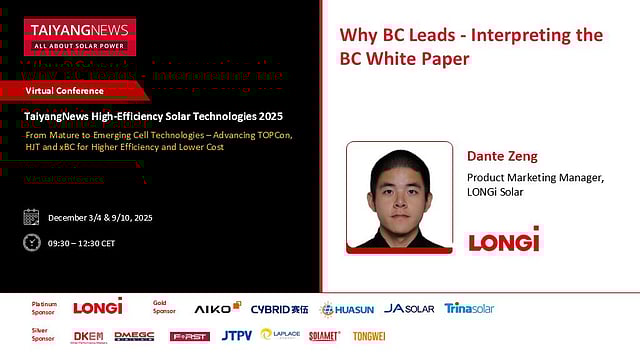Dante Zeng, Product Marketing Manager at LONGi, will address the topic ‘Why BC Leads – Interpreting the BC White Paper’ on Day 1 of our annual flagship event, the TaiyangNews High-Efficiency Solar Technologies Conference.