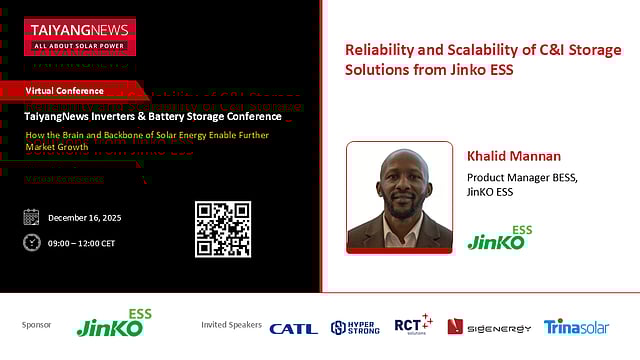 Khalid Mannan, Product Manager BESS at Jinko ESS, will be delivering a presentation titled ‘Reliability and Scalability of C&I Storage Solutions from Jinko ESS’ at the 2nd edition of the TaiyangNews Inverters & Battery Storage Conference on Tuesday, December 16, 2025. The Conference will feature top experts discussing how advanced inverters and battery storage are shaping resilient, future-proof solar energy systems.