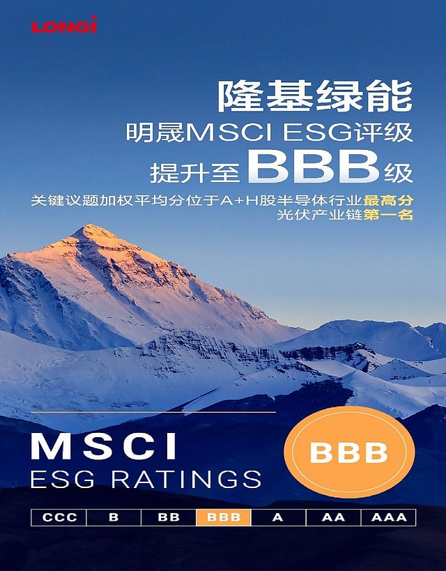 Global rating agency Morgan Stanley Capital International (MSCI) has upgraded LONGi’s environmental, social and governance (ESG) rating to BBB in 2024, placing it at the top of the A-share and H-share listing for the semiconductor industry and the PV sector. The MSCI report highlights LONGi's leadership in business ethics, water resource management, and talent management practices. It also commends significant progress in supply chain management, with stringent ESG oversight mitigating potential risks effectively.