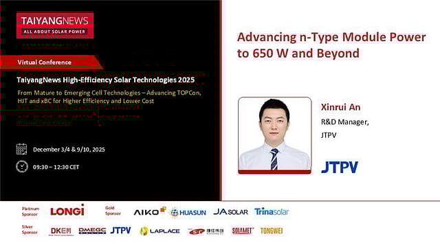 Xinrui An, R&D Manager at Jietai Solar (JTPV), will be presenting on the topic titled Advancing n-Type Module Power to 650 W and Beyond on Day 3 of the TaiyangNews High-Efficiency Solar Technologies 2025 Conference. The Conference will focus on TOPCon technology on December 9, 2025, followed by Heterojunction on December 10, 2025.