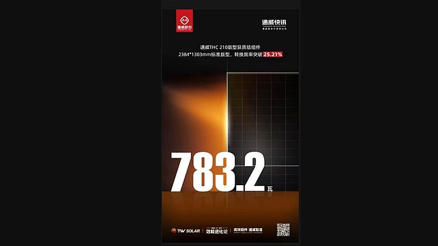 Integrated solar manufacturer Tongwei’s Photovoltaic (PV) Technology Center has announced that its THC 210 heterojunction (HJT) module has achieved a power output of 783.2 W. The module, measuring 2384 × 1303 mm, also achieved a conversion efficiency exceeding 25.21%, as verified by TÜV. The company claims this is a new record, surpassing the 780 W threshold. Tongwei says that its PV R&D team has made significant advancements in HJT cell and module integration technology over the past 2 years, increasing module power output by more than 60 W and conversion efficiency by over 2 percentage points. It is the 10th time the team has set a new record for HJT module performance, claims Tongwei.