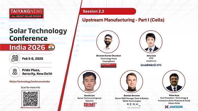 The session Upstream Manufacturing – Part I (Cells) at the TaiyangNews Solar Technology Conference India (STC.I) 2026 brings together Damian Brunner, Senior R&D Manager Solar & Battery at RENA Technologies; Jerry Liao, Chief Technology Officer at Leadmicro; Daniel Lim, Senior Technical Engineer at Solamet; Vikas Arya, Vice President – Technology & Innovation (Solar Modules & Cells) at Jakson Solar. The session will be moderated by Shravan Kumar Chunduri, Technology Head at TaiyangNews.
