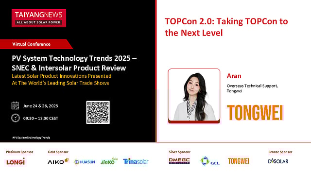 Aran, Overseas Technical Support at Tongwei, will be presenting on the topic TOPCon 2.0: Taking TOPCon to the Next Level at the TaiyangNews Virtual Conference on PV System Technology Trends – SNEC & Intersolar Product Review.