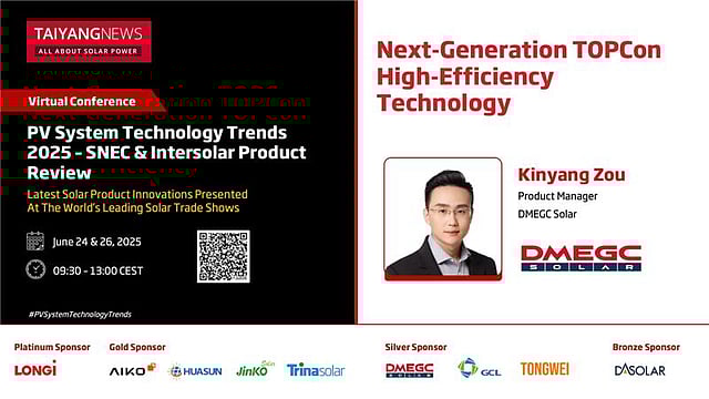 Kinyang Zou, Product Manager at DMEGC Solar, will be speaking on the topic Next-Generation TOPCon High-Efficiency Technology and Differentiated Solutions at the TaiyangNews Virtual Conference on PV System Technology Trends – SNEC & Intersolar Product Review.