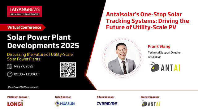 Frank Wang, Technical Support Director at Antaisolar, will be speaking at the TaiyangNews Solar Power Plant Developments 2025 Virtual Conference to be held on Tuesday, May 27, 2025 from 09:30 – 13:30 CET. He will be presenting on the topic Antaisolar’s One-Stop Solar Tracking Systems: Driving the Future of Utility-Scale PV.