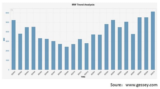 While not disclosing specific export figures for October, Gessey reported that export volumes rose 21.1% month-on-month (MoM) and surged 126.3% from October 2024. The top 5 export destinations in October were India, Vietnam, Laos, Indonesia, and Djibouti, with India alone accounting for 42.0% of total shipments. The average export price in October stood at $0.035/W, down 48.8% YoY and 25.4% MoM.