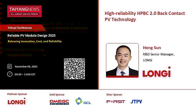 Heng Sun, R&D Manager at LONGi, will be participating in the TaiyangNews Virtual Conference on Reliable PV Module Design on Thursday, November 6, 2025, sharing insights on the topic: High-Reliability HPBC 2.0 Back Contact PV Technology.