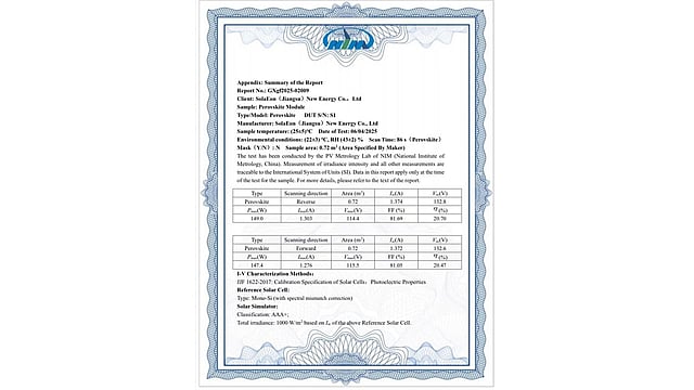Earlier this year, SolaEon revealed that modules from its 200 MW pilot line successfully passed TÜV Rheinland’s full IEC 63163 testing and obtained RoHS compliance certification. In April, its perovskite solar cell module achieved a steady state efficiency of 19.2% based on 1,027.1 cm2 area (see SolaEon Technology Announces World Record For Perovskite Modules). In June, it reported achieving 21.88% photoelectric conversion efficiency on a 0.64 m2 illuminated area, corresponding to a power of up to 140 W (see China Solar PV News Snippets).