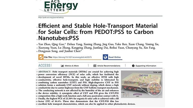 The team combined the high conductivity and optical properties of carbon nanotubes (CNT) with the passivation effect of polystyrene sulfonate (PSS) to create a non-doped, highly efficient, and stable hole transport material CNT:PSS. Using monocrystalline silicon as a substrate, the team coated it with a CNT:PSS thin film to produce CNT:PSS/Si cells, achieving over 23.3% efficiency, with simulations indicating the potential to reach 29%.