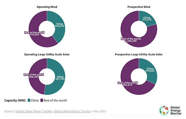 Operational solar capacity of China at the end of Q1/2023 was 228 GW, counts the GEM, while that of offshore wind was 31.4 GW and onshore wind over 278 GW. The numbers continue to grow however, as sccording to the National Energy Administration (NEA), at the end of May 2023, China's total installed PV capacity had risen to 454 GW and that of wind power to 380 GW (see Impressive Chinese Solar PV Growth Numbers).