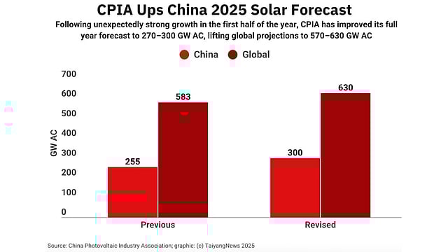 CPIA has raised its 2025 solar forecast for the China market to 270 GW AC to 300 GW AC, as H1 installations exceeded expectations