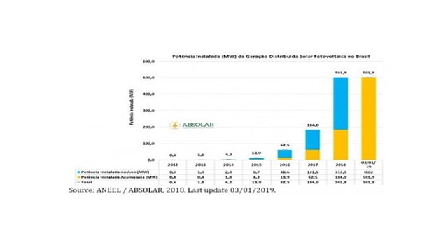 Brazilian solar association ABSOLAR says the country has achieved and exceeded the 500 MW milestone for installed capacity of distributed small-scale solar PV systems on January 3, 2019, referring to the country's electricity regulatory agency xc. Total number of installed solar systems were 49,177, representing 501.9 MW. During 2018 alone, 317.9 MW was installed.