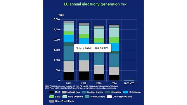 Electricity from hydro and solar PV increased by more than 40 TWh year-on-year (YoY), corresponding to half of the annual power demand in Belgium and the whole annual demand in Denmark. Solar PV contributed 236.52 TWh in 2023 to the EU mix, and increased it to 281.09 TWh in 2024.