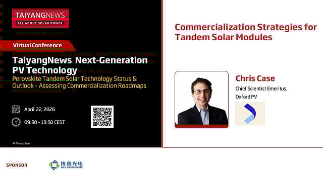 Oxford PV’s Chief Scientist Emeritus, Chris Case, will be a part of the TaiyangNews Virtual Conference on Next-Generation PV Technology on April 22, 2026. Case will share the commercialization strategies for tandem solar PV modules, and will also be a part of the panel discussion. Registrations are free here.