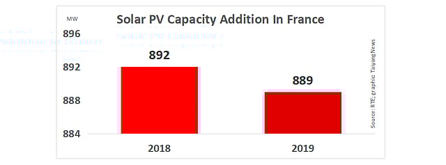 At the end of 2019, France reported a cumulative operational solar PV capacity of 9,436 MW after adding 890 MW last year. PV accounted for 2.5% of annual electricity consumption of the country, increasing its share from 2.3% in 2018. The cumulative capacity of 9.43 GW generated 11.6 TWh of solar power in 2019, increasing 7.8% from previous year, according to the national electricity transmission system operator RTE.