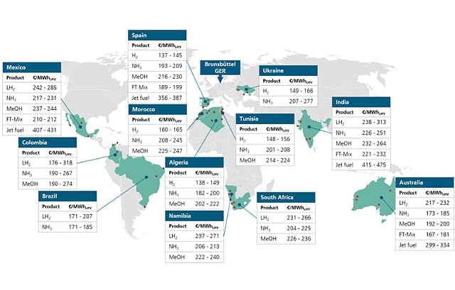 The low levelized cost of renewable electricity in the 3 nations—between €35/MWh and €47/MWh for solar PV and within €41/MWh and €55/MWh for wind energy—are listed as the main reason for the favorable PtX production cost.