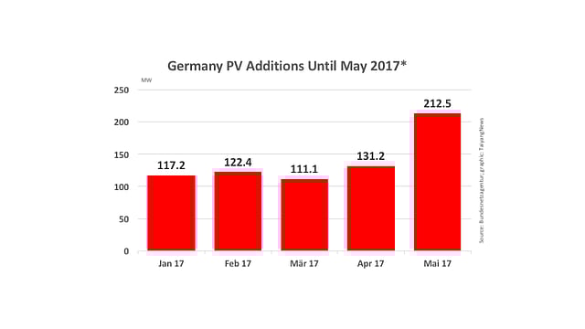 Germany added 212.46 MW of new solar power capacity in May 2017. With this, its cumulative PV capacity touched 41.8 GW. The capacity for the month of MW includes 76.4 MW from solar parks, according to the German Federal Network Agency.