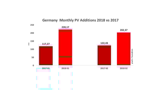After beating new PV additions of the previous 2 years in January 2018, Germany's market has somewhat slowed down again, although it remained above the 200 MW level. In February 2018, Germany's new capacity addition was 202.371 MW, down from 220 MW reported in the previous month (see Germany Hits January PV High Of 220 MW).
