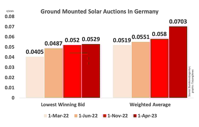 Winning tariffs ranged between €0.0529/kWh as lowest and €0.0730/kWh as highest with an average weighted of €0.0703/kWh. In the previous round held on November 1, 2022, tariffs were determined as €0.0520/kWh, €0.0590/kWh and €0.0580/kWh respectively, which means the lowest bids remained at basically the same level, while the maximum is much higher now (see Another Undersubscribed Solar Auction In Germany).